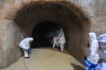 We turn back, always amazed by the huge concrete tunnel. We climb back up to the surface, panting. Our bodies are sweating from the action of the white robes, a kind of monkey suit reminiscent of those worn by the scientific police, which we hastily get rid of. And the gloves. And the masks. The smell, which seemed to have disappeared downstairs, will keep us company for some time to come, even for the next few days.