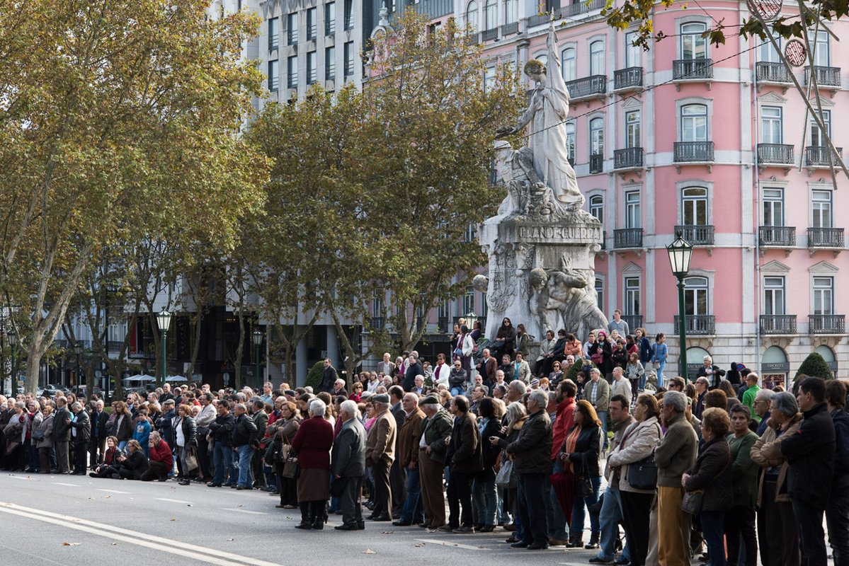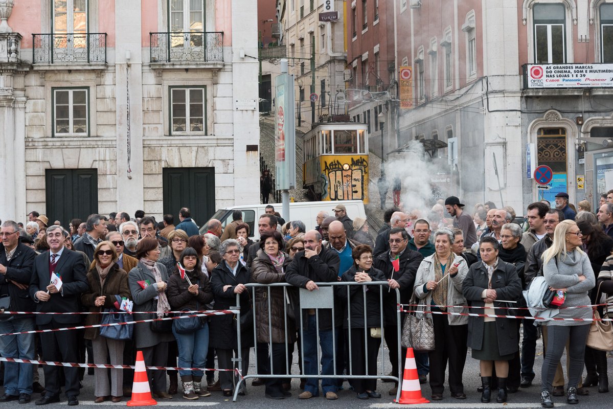 Entre os aplausos de muitos populares que acorreram ao local, o desfile abriu com a atuação do grupo TocáRufar. Na tribuna na Praça dos Restauradores, o vereador Carlos Castro, da CML, e José Ribeiro e Castro, do Movimento 1º de dezembro, ombreavam com diversas individualidades convidadas, nomeadamente, da SHIP e da EGEAC, que produziu o desfile em co-produção com a RTP.