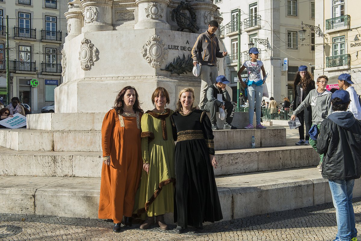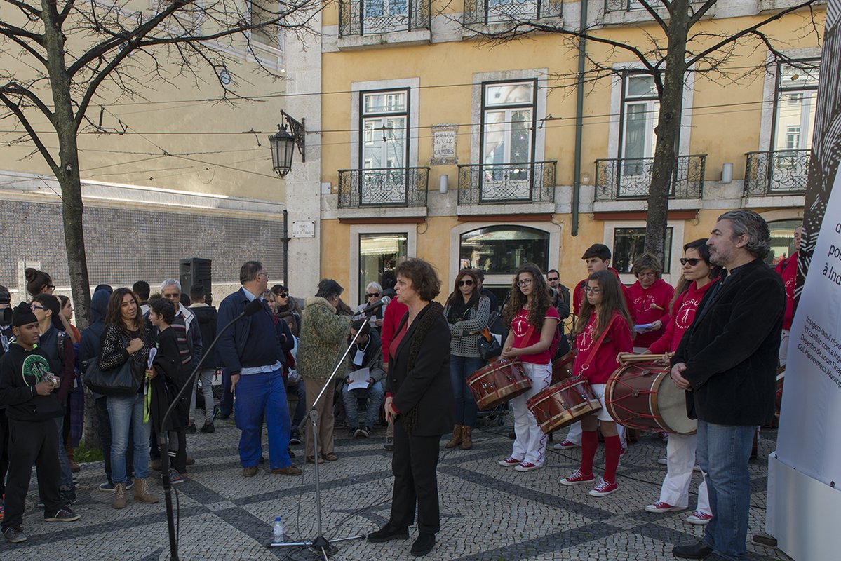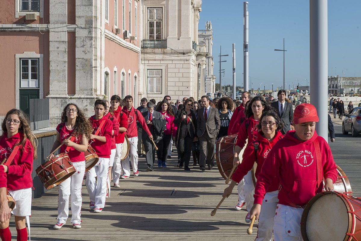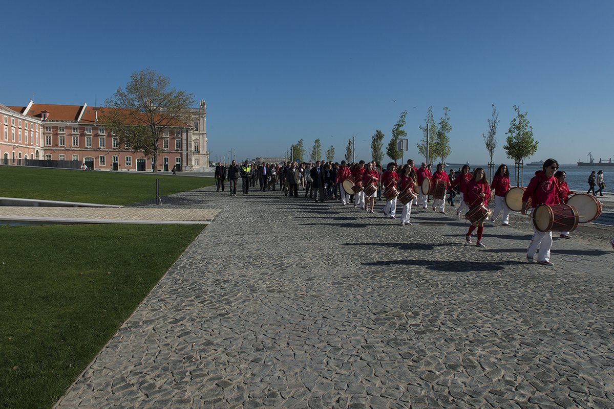 Aqui, com a participação do olisipógrafo José Sarmento de Matos, e do ator André Gago, que leu extratos da crónica de Fernão Lopes, onde é "historiado este momento fantástico que se passou aqui em 1383", deu-se início a um percurso, ritmado pelos Tocá Rufar, acompanhado pelo presidente da Câmara e vereadores, e alunos da escola Passos Manuel, que atravessou o Terreiro do Paço, e Cais do Sodré, até à Praça Luís de Camões, com a presença da banda do regimento de Sapadores Bombeiros.
