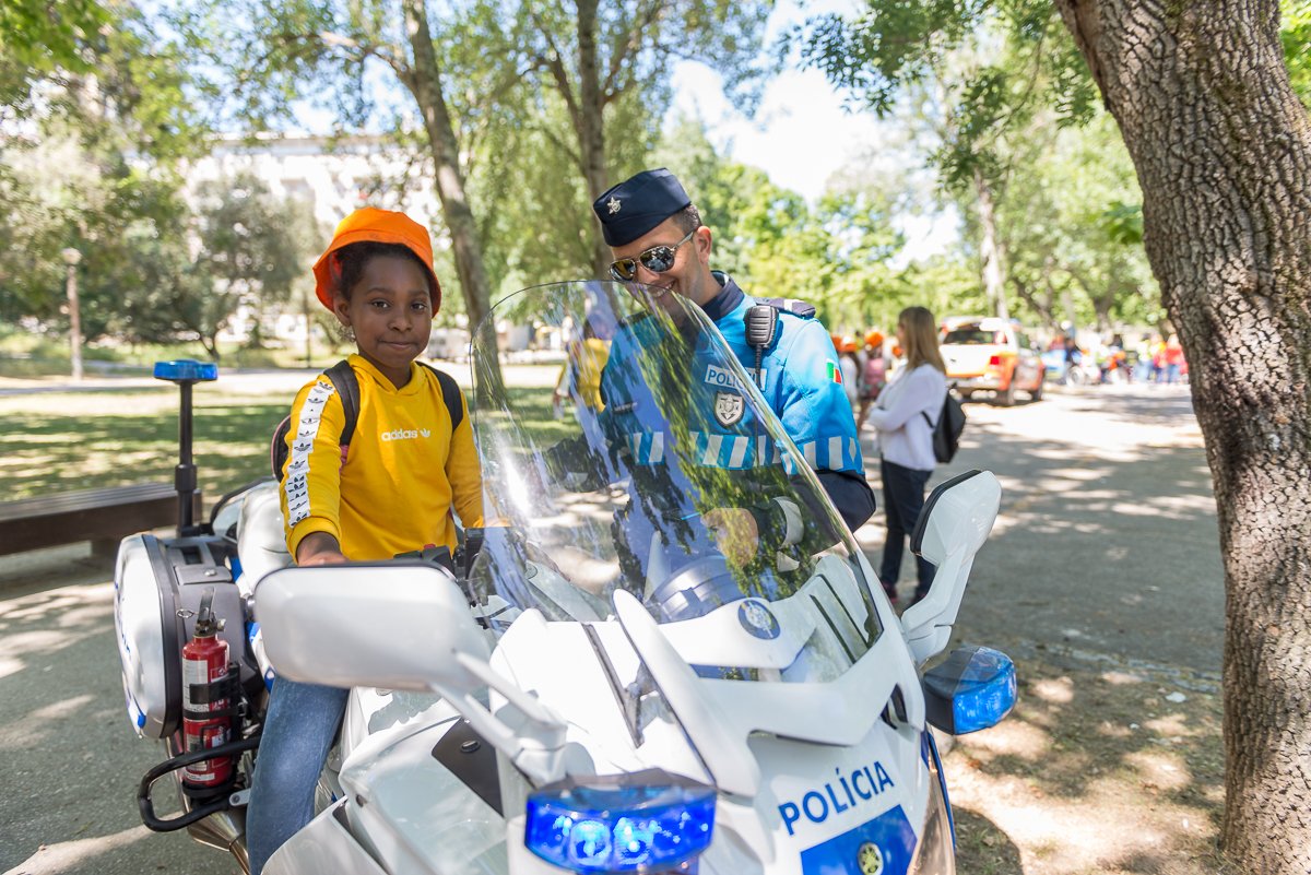 O agente da PSP, Nuno Correia, da Esquadra de Motociclistas da Divisão de Trânsito, não tinha mãos a medir com a pequenada a querer experimentar a sua potente moto” e falou-nos da iniciativa.” Esta interação é muito importante porque vai-se refletir a longo prazo. Os miúdos vão aprender a respeitar e a não ter medo da polícia e, a brincar, também aprendem regras de segurança”.