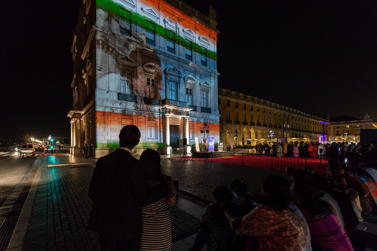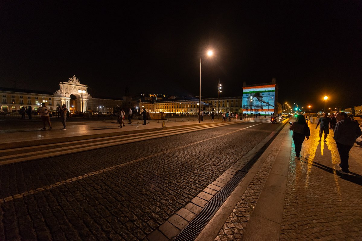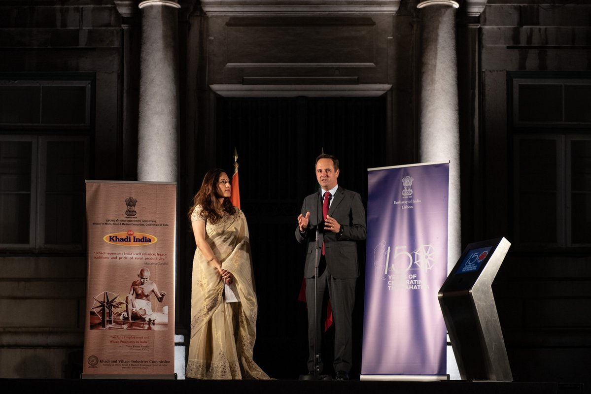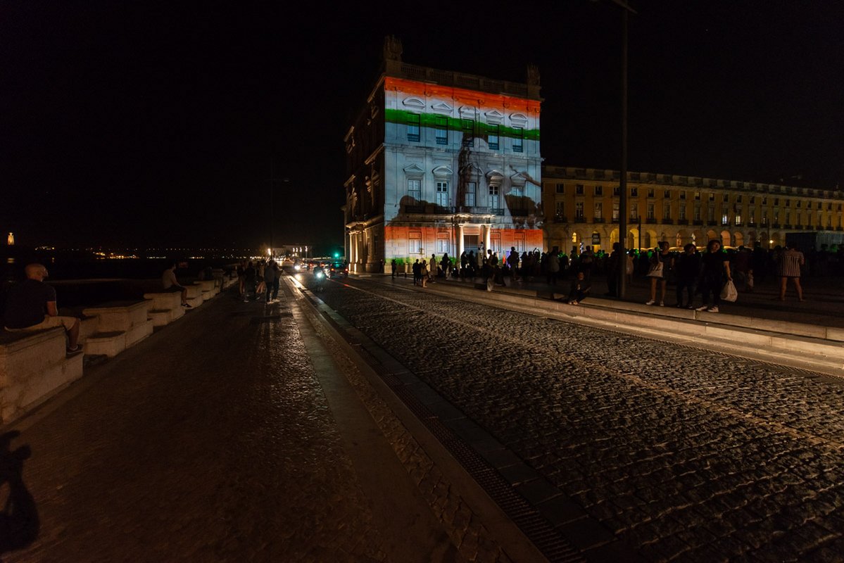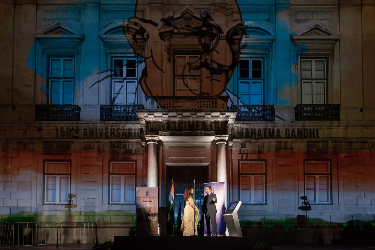 O presidente da autarquia lisboeta, Fernando Medina, e a embaixadora da República da Índia, K. Nandini Singla, premiram em conjunto o botão que deu início à projeção. Na ocasião, a representante diplomática indiana agradeceu a presença do Corpo Diplomático que marcou presença e o apoio da Câmara de Lisboa que tornou possível esta iniciativa e lembrou o facto do primeiro ministro português, António Costa, fazer parte da Comissão destas comemorações e de ser uma figura popular nos media indianos onde, por vezes, é referido como o "Gandhi de Lisboa".