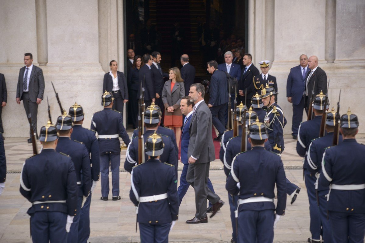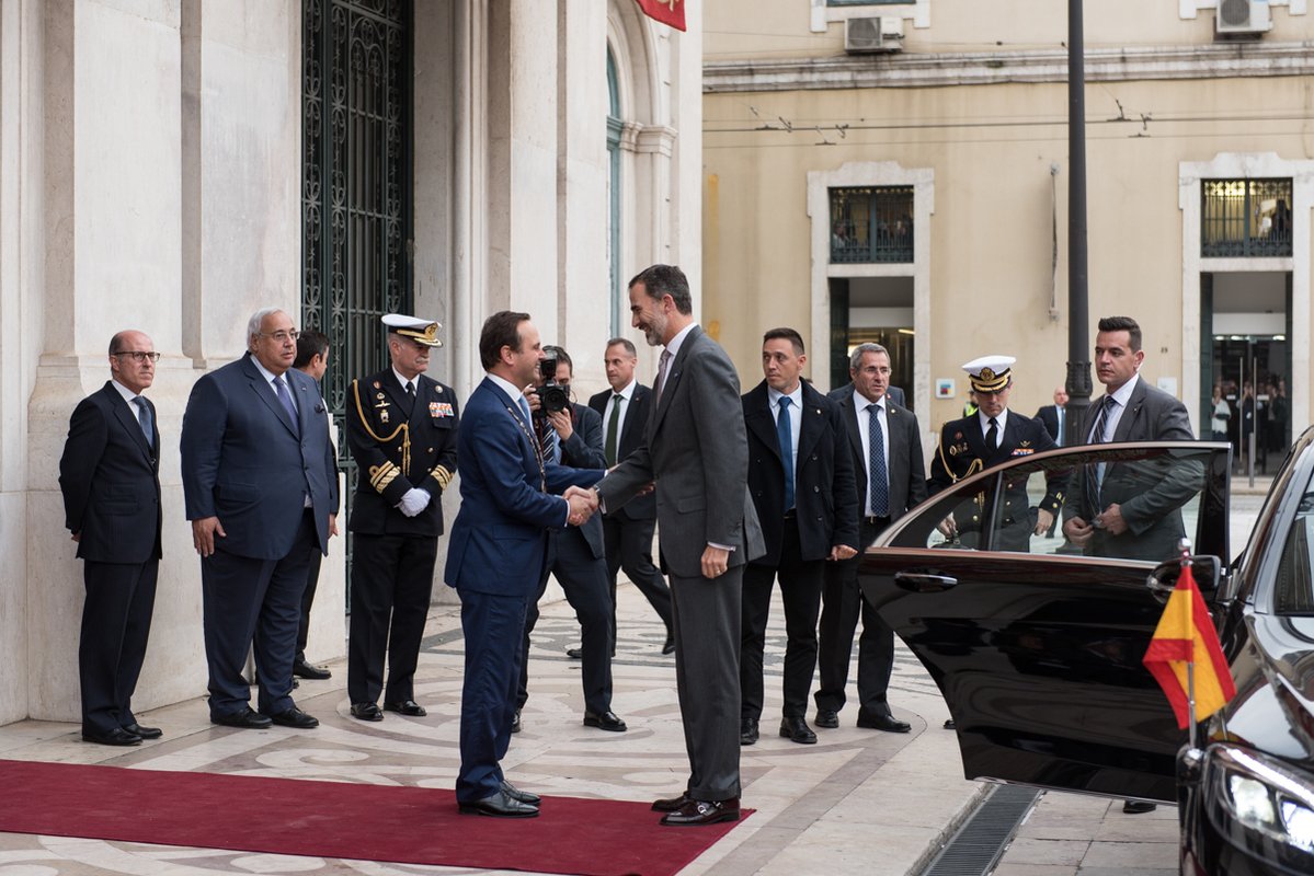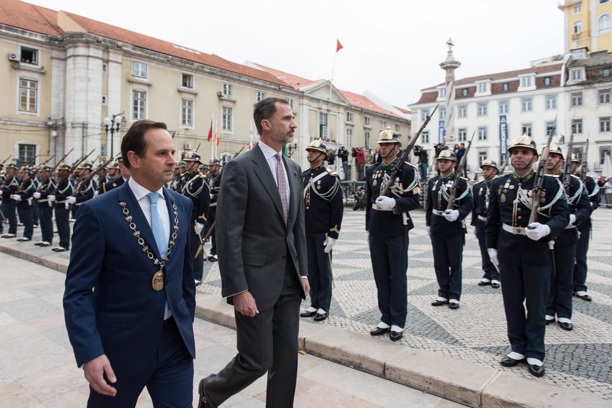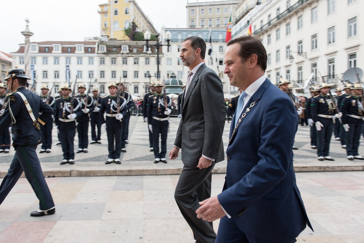Depois da revista à Guarda de Honra, a um batalhão da GNR com Banda e Estandarte, que executou os hinos nacionais dos dois países, o monarca espanhol recebeu cumprimentos da Vereação e da presidente da Assembleia Municipal de Lisboa, Helena Roseta, ainda no Átrio dos Paços do Concelho. Já no Salão Nobre, onde eram aguardados por centenas de convidados, incluindo os membros do Corpo Diplomático acreditado em Lisboa, teve lugar a cerimónia de boas vindas, que incluiu a entrega da Chave da Cidade a Filipe VI e a aposição da sua assinatura no Livro de Honra de Lisboa.