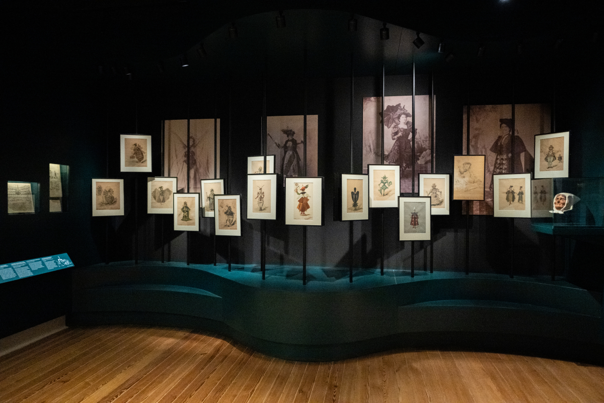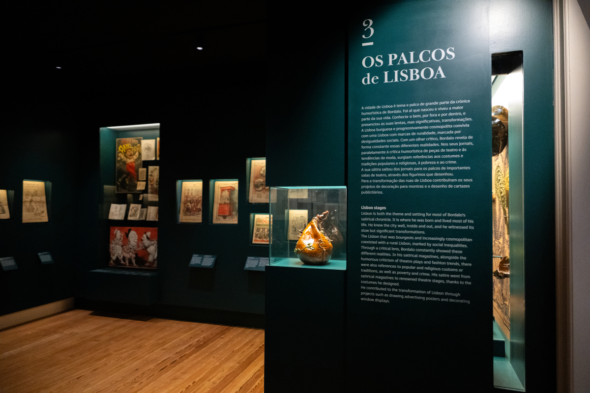 O núcleo seguinte abre as portas aos palcos de Lisboa, os teatros e a cidade como cenário vivo. Bordalo surge como cronista atento, crítico teatral, observador mordaz do quotidiano urbano. A exposição evidencia a sua relação com o teatro, o desenho de figurinos, a publicidade e a crítica social, em temas que, no diálogo com a cidade, mantêm uma inquietante atualidade: rendas, despejos, desigualdades, moralidade pública.